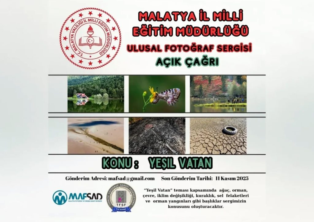 Malatya İl Milli Eğitim Müdürlüğü tarafından 24 Kasım Öğretmenler Günü münasebetiyle ”YEŞİL VATAN” teması çerçevesinde düzenlenen Ulusal Fotoğraf Sergisi açılıyor. Malatya Fotoğraf ve Sinema Sanatı Derneği-MAFSAD ve Türkiye Fotoğraf Sanatı Federasyonu’nun desteğiyle gerçekleştirilecek olan bu kıymetli sergi için sadece öğretmenlerin çektiği fotoğraflar seçildi.
